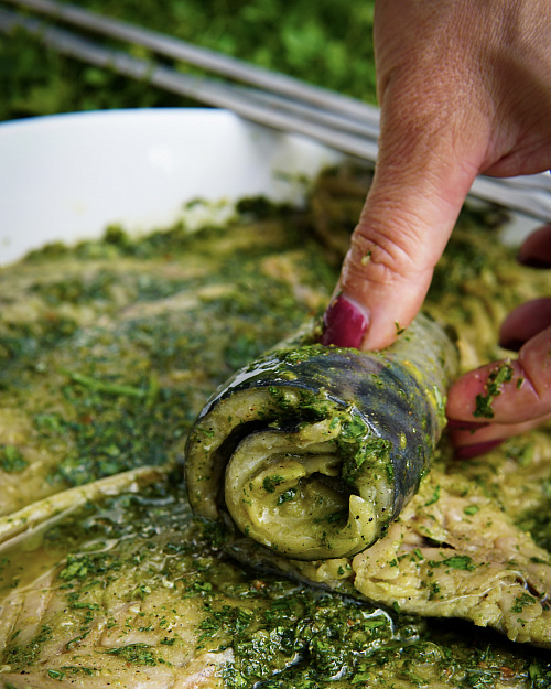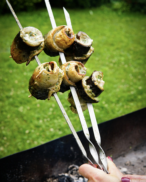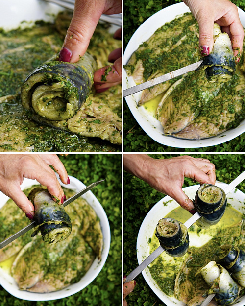 Скручиваем филе в рулетик, как показано на фото, и насаживаем на шампур со стороны хвоста