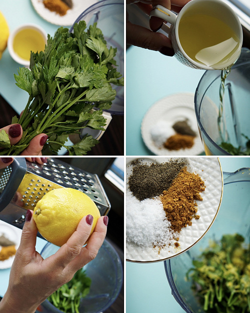 Моем петрушку, бросаем её в блендер. Добавляем к ней растительное масло. Далее - цедру лимона, она придаёт особенный вкус